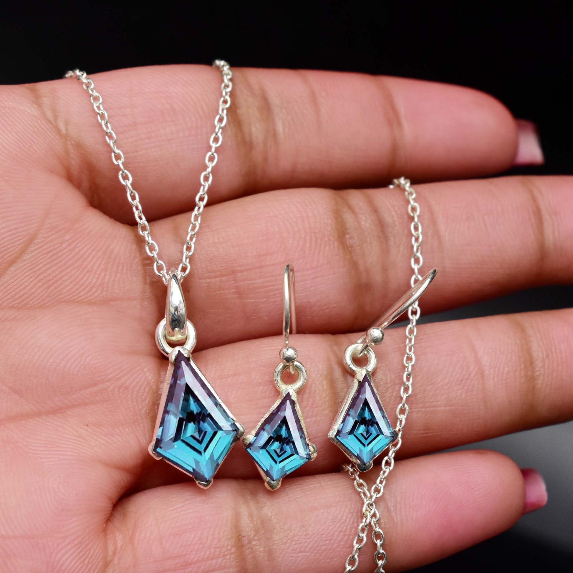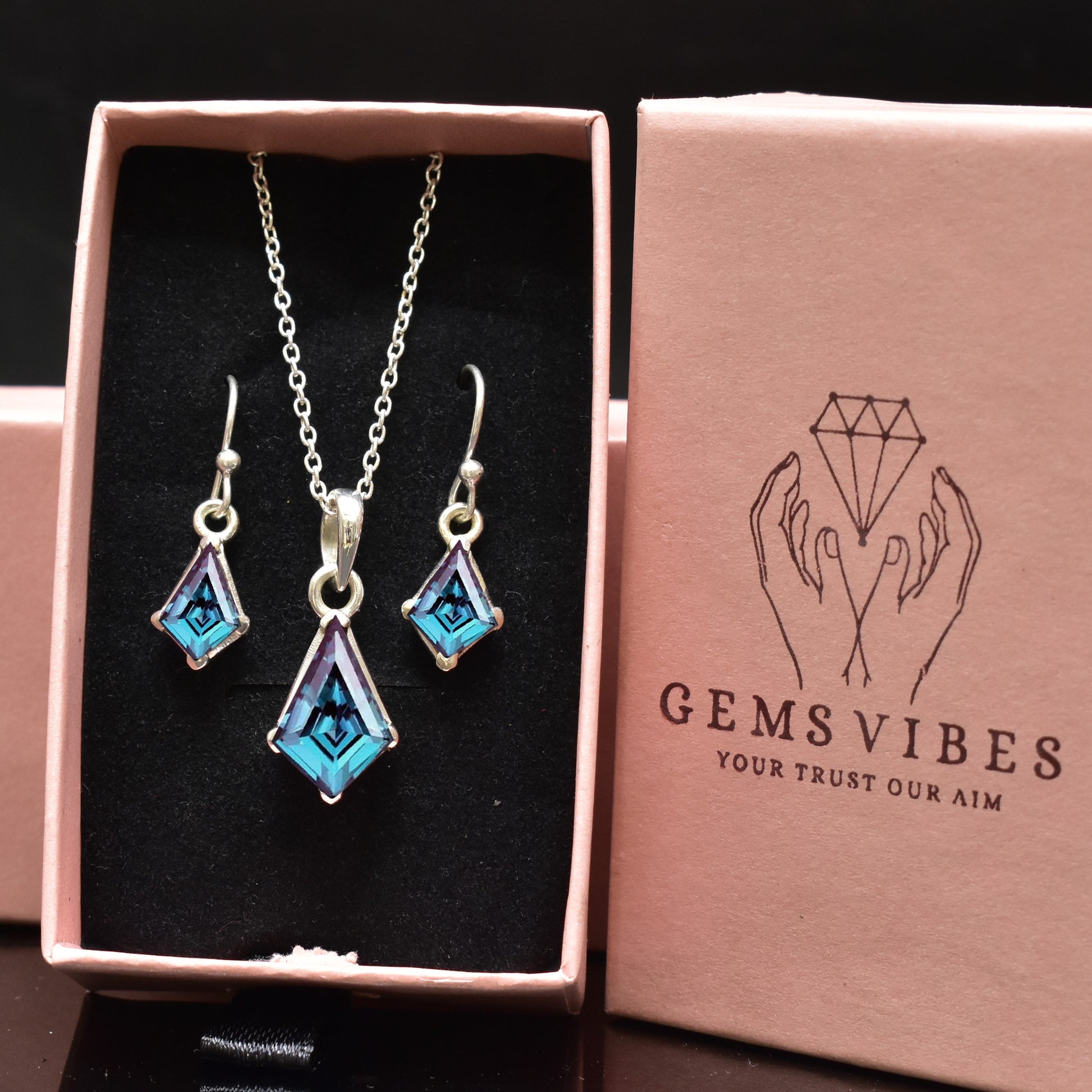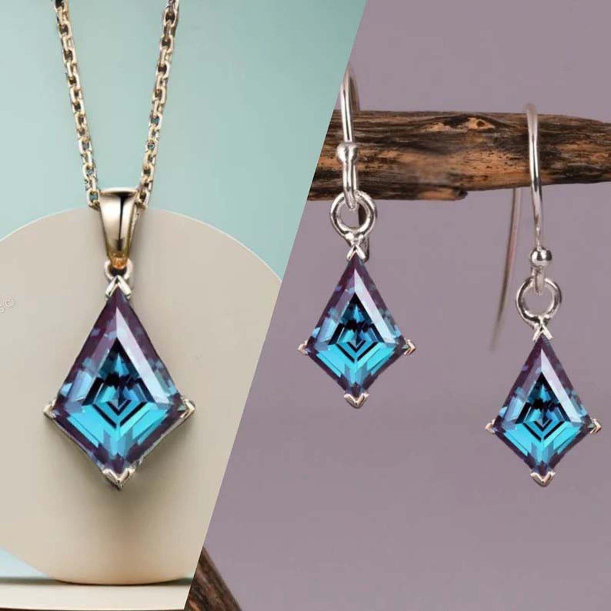 This unique and elegant Alexandrite pendant earring set is perfect for any special occasion. Made with high quality S925 Sterling Silver, these vintage earrings feature a kite-shaped Alexandrite gemstone, known as June's birthstone. The color-changing effect of the gemstone adds a touch of mystique to this handmade designer jewelry set by GEMS VIBES. A perfect gift for any jewelry lover.