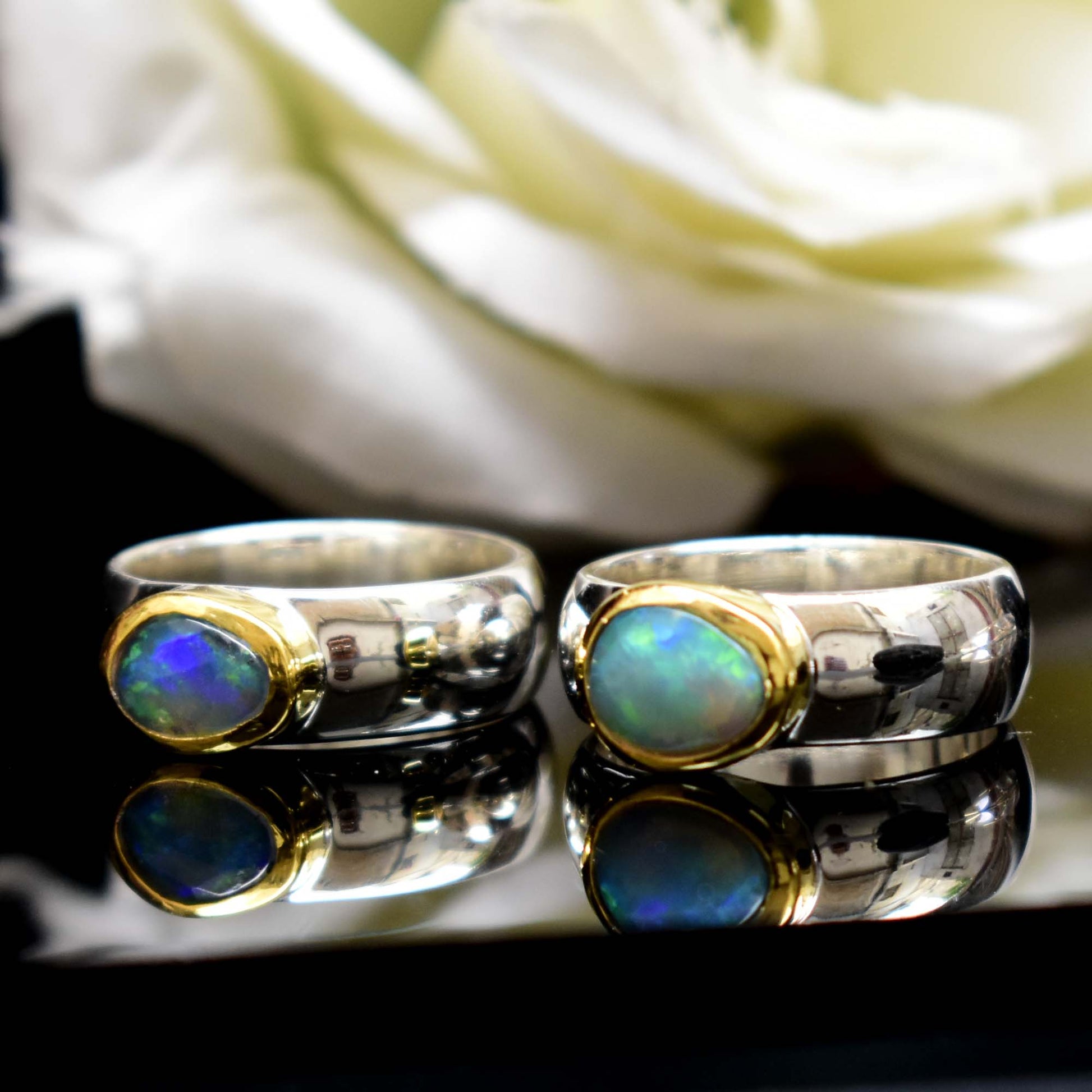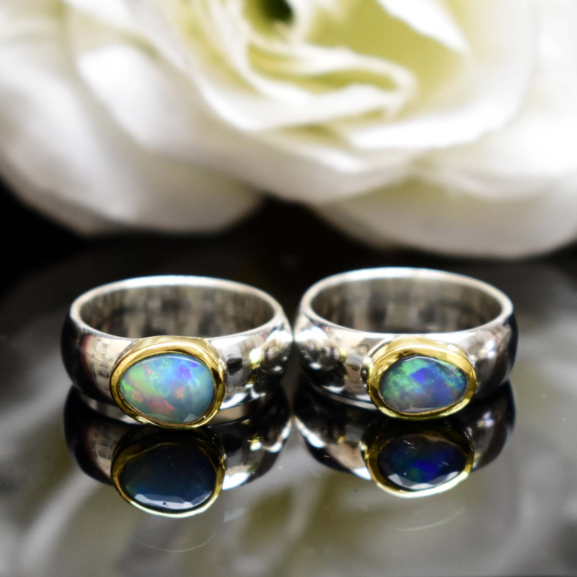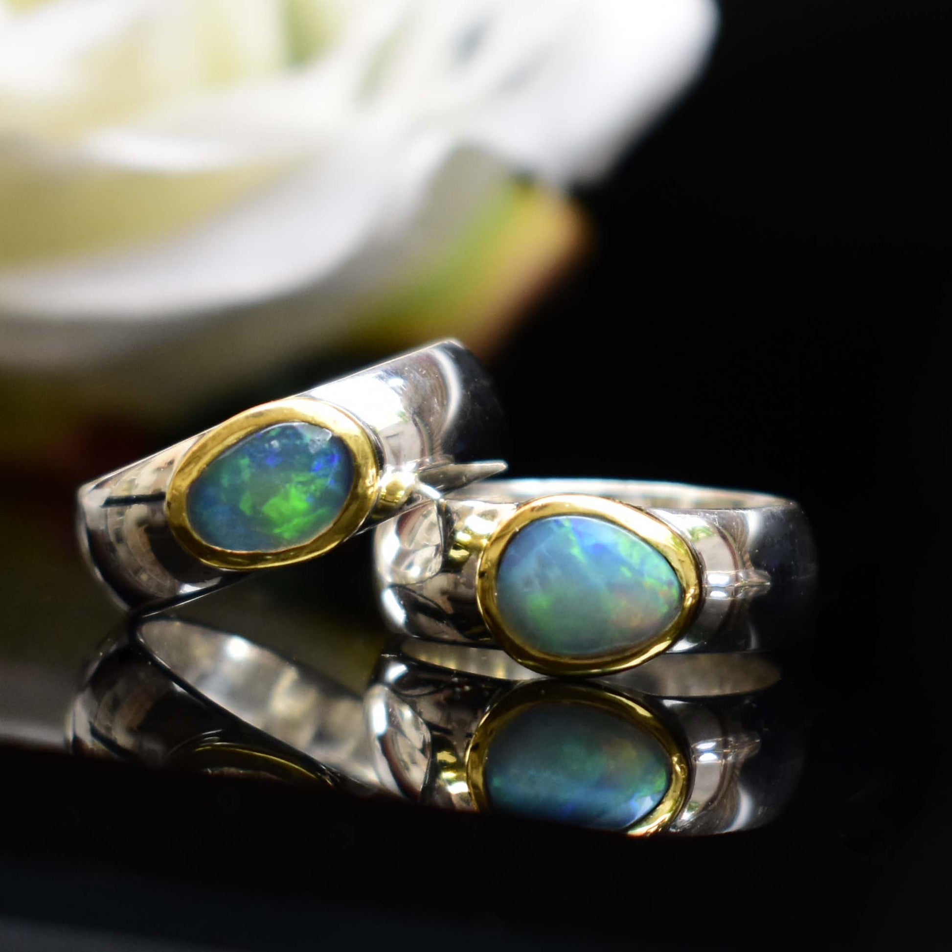 This stunning Ethiopian Opal ring is a beautiful and unique addition to any jewelry collection. Stone is free shape just like oval-shaped opal is set in a two-tone yellow gold and silver band, creating a stunning contrast of colors. The opal's play of color is simply mesmerizing, and it will catch the eye of everyone who sees it.